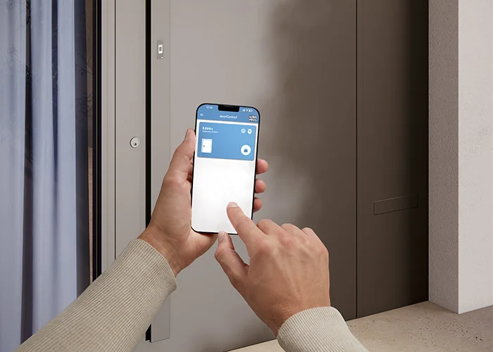 The blueMatic EAV4 from Winkhaus is an automatic multi-point locking system with a motorized door opener function, suitable for all frame materials. The "+" in this version of the EAV4+ motorized automatic locking system stands for a built-in radio module. This communicates via Bluetooth® with the smartphone and the Winkhaus doorControl app installed on it. This allows the entrance door to be conveniently unlocked using the smartphone.
